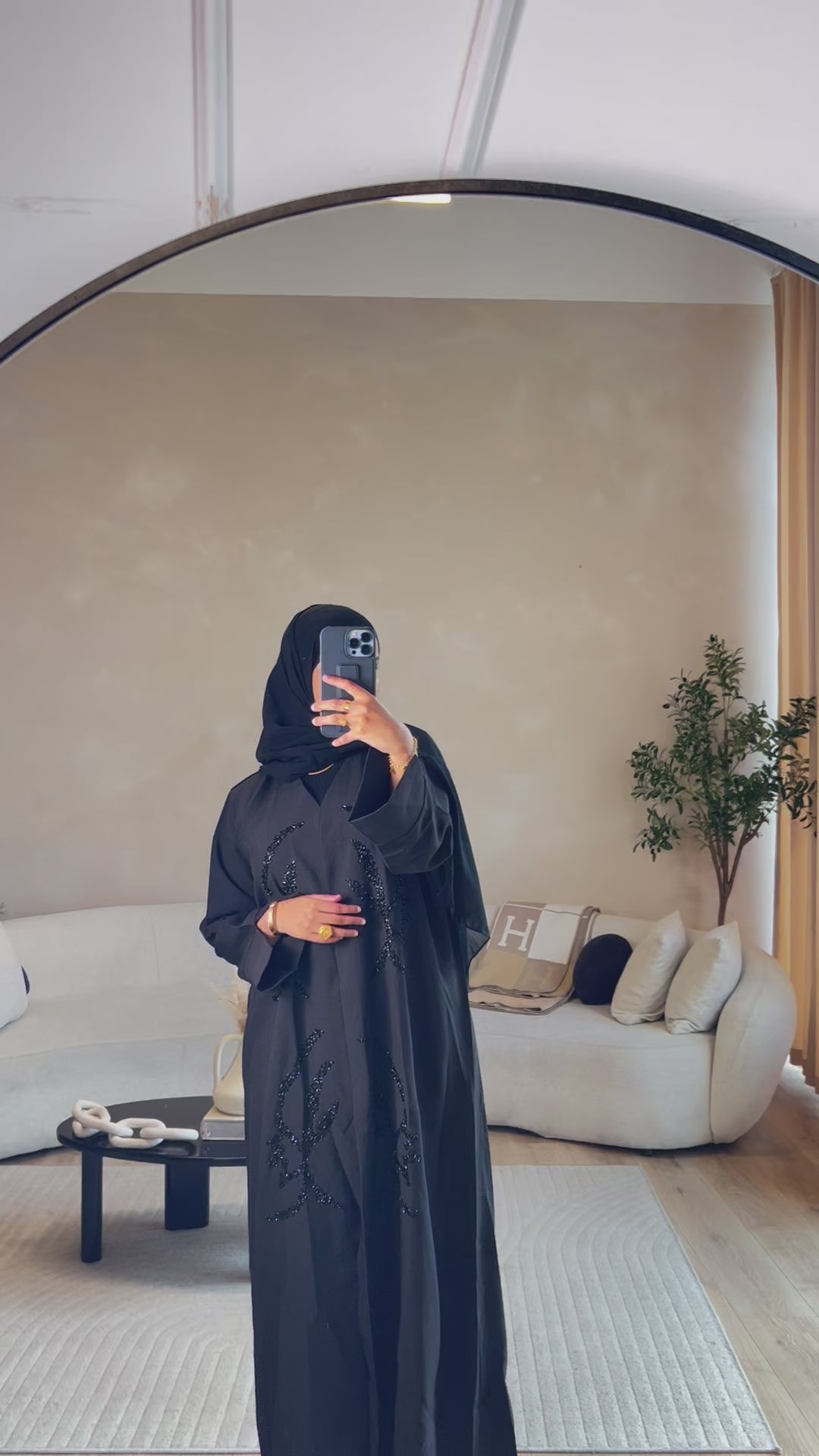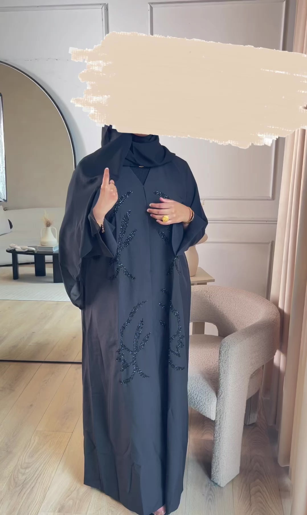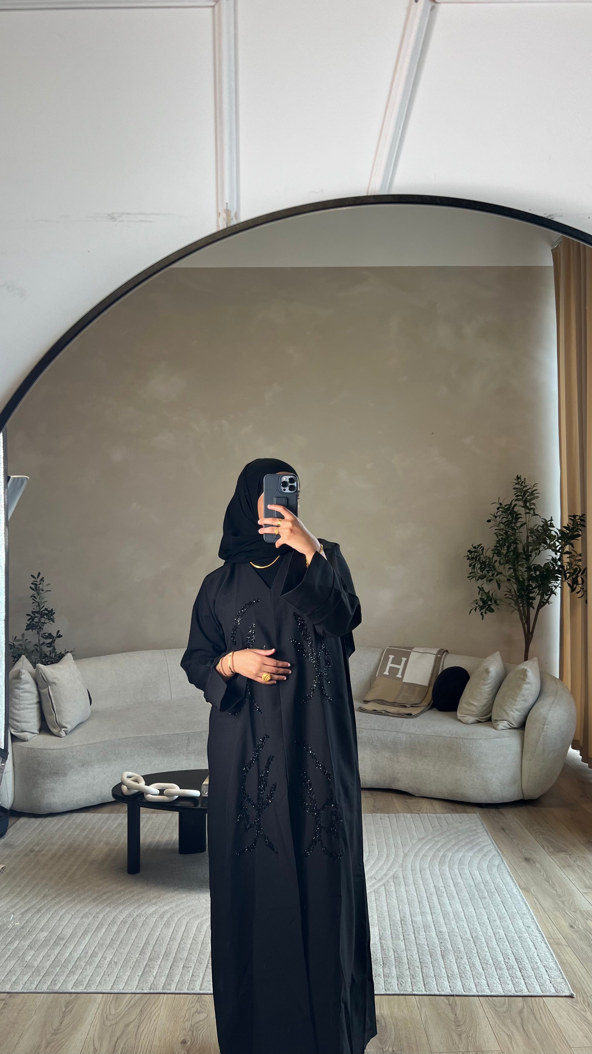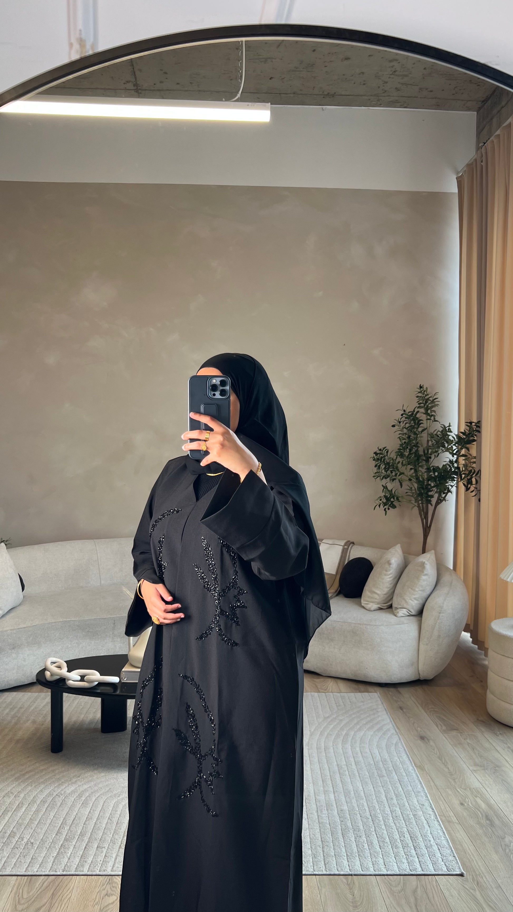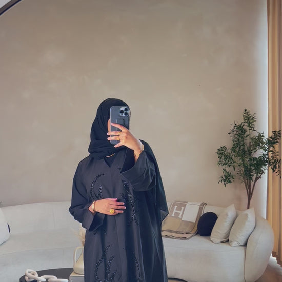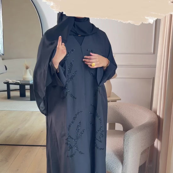 Black open abaya embodying all things class and elegance. High quality fabric with a bold intertwined hand stitched beading pattern with a detailed split wrist.